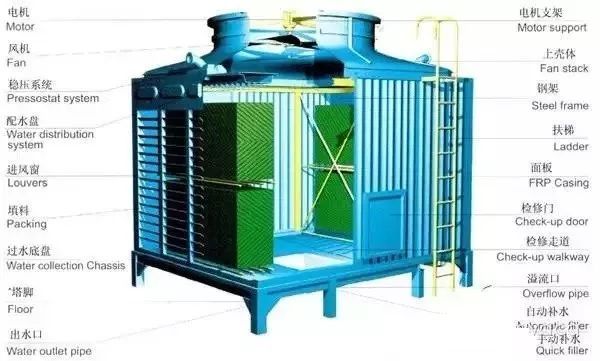 冷卻塔在配水冷冷水機(jī)使用時(shí),它的功能同樣是制冷。工作原理是:把攜帶熱量的冷卻水在塔中和空氣進(jìn)行熱交換,把熱量傳輸給空氣并散入大氣環(huán)境中去,以此達(dá)到給水冷冷水機(jī)提供冷卻水的目的。在冷卻水系統(tǒng)中主要起到