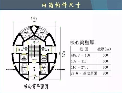 廣州塔的塔身由下而上富有大小變化。其中,底部橢圓直徑尺寸約為60米×80米,高寬比為7.5;中部最細(xì)處橢圓直徑約為30米,高寬比為7.3。上部橢圓直徑尺寸約為40.5米×54米。24根立柱的間隔距離相當(dāng),協(xié)調(diào)統(tǒng)一。